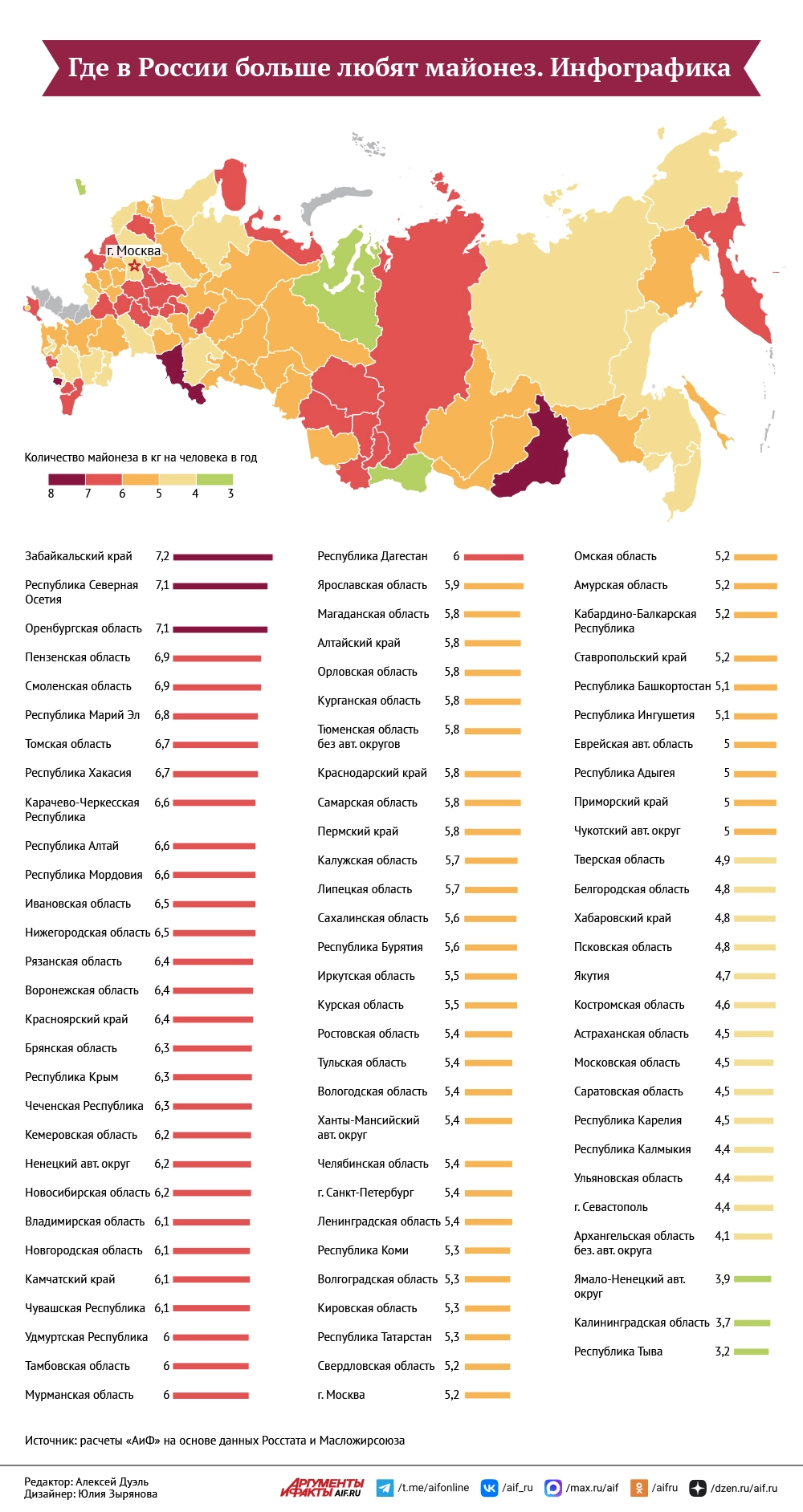 Рейтинг потребления майонеза, составленный журналистами aif.ru, на большую научную ценность не претендует. За основу взяли оценку потребления майонеза в 2025 году от Масложирсоюза — 819 тыс. тонн, актуальные данные о численности населения каждого из регионов России (кроме новых) — от Росстата, а также данные исследования службы государственной статистики о частоте использования семьями продуктов с пониженным содержанием жиров, в котором, среди прочего, были сведения о том, какая часть опрошенных использует низкокалорийную заправку для салата вместо майонеза — просто взяли обратное значение от этой величины. Ни ретейлеры, ни отраслевые союзы не смогли оперативно представить более точные данные о потреблении народного соуса в России.