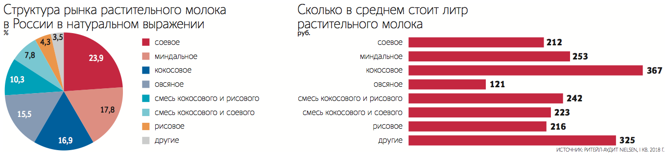 Спрос на молоко из сои, орехов и круп в России растет небывалыми темпами. В I квартале 2018 г. его продажи выросли в 2,5 раза в натуральном выражении по сравнению с показателями годичной давности, подсчитали аналитики Nielsen. По их данным, с января по март россияне купили в крупных федеральных сетях 1 млн л растительного молока на 461,4 млн руб. Для сравнения: за весь прошлый год было продано 1,7 млн л. Сегодня растительное молоко стоит на полках каждого четвертого магазина крупных розничных сетей.